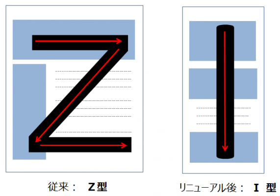 パソコンが主流の従来では、サービスをすみずみまで理解しようとするため、人の視線が「Z型」に動いていたのに対し、昨今多くの人はスマホを使ってサイトを見るため、フリックしながら飛ばし読みをする「I型」でサイトを閲覧する傾向が強いことをマーケティング要素として取り入れ、お客様がストレスなくサービスを理解できるよう改修致しました。