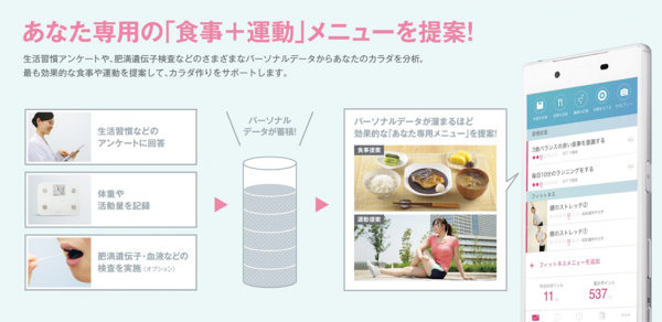 「パーソナルカラダサポート」は、お客さまの生活習慣アンケートの結果や体重・歩数などのライフログ、肥満遺伝子検査などのパーソナルデータをもとに、一人一人専用の生活習慣改善メニューをスマートフォン向けアプリにて表示するサービスです。また、利用者間のSNS機能や、ECサイト「ヘルスケアモール」にて専門家からの食事指導などが受けられます。