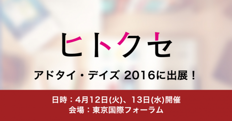 動画広告やネイティブ広告、リッチメディア広告の配信プラットフォームを提供する、株式会社ヒトクセ(本社:東京新宿区、代表取締役:宮崎航、以下「ヒトクセ」)は、4月12日(火)、13(水)の2日間、東京国際フォーラムにて開催される、宣伝会議 AdverTimes DAYS 2016に出展致します。