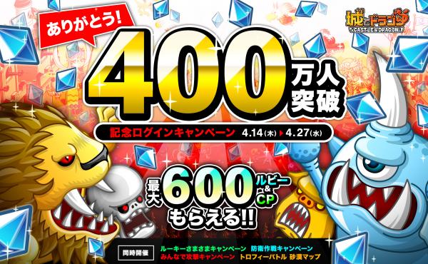 4/14(木)メンテナンス後より、『城とドラゴン』の登録ユーザー数が400万人を突破したことを記念して、