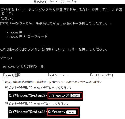 障 害時はWindows7ライクなスタートアップ画面よりF8 → コンピュータの修復 → トラブルシューティング → 詳細オプション → コマンドプロンプト → ログオン → コンソール画面へ移動し、Ver2が備える復元コマンドを打つと[前回正常起動時の構成]に戻します。