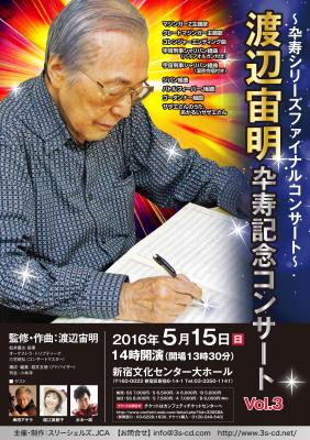 スリーシェルズは、5月15日に開催する「渡辺宙明卆寿記念コンサートVol.3」へ、歌手の水木一郎が出演することを2016年4月18日に発表した。アニメソングの帝王として世界で知られる水木一郎にとっても、渡辺宙明の曲は欠かせないもの。昨年の8月30日のコンサートVol.1には、別のコンサートがあり出演がかなわなかったが、ついに公式に出演。