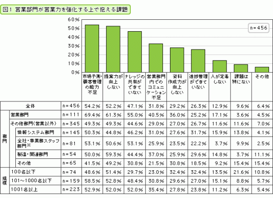 また、部門ごとに見ると1位の「市場予測・顧客管理の能力不足」については、営業部門が69.4%であるのに対し、その他部門(営業以外の部門)は49.3%で約20%の差が生まれています。その他2位~5位の項目においても約10ポイントの差があり、営業部門とその他の部門の認識の違いが顕著に現れる結果となりました。