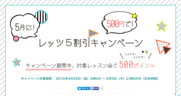 4月29日から5月5日の期間中、キャンペーン参加のバラエティ富むオンラインレッスンが1レッスン500円のワンコインでご受講頂ける、「5月に!500円で!レッツ5割引キャンペーン」を開催します!