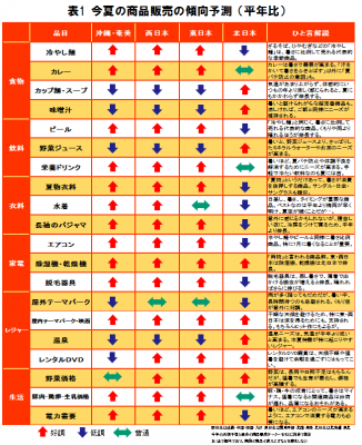 今年(2016年)の夏の天候を1998年をベースに考えた場合の産業界への影響についてまとめます。今夏の天候を「北冷西暑」あるいは「北並西暑」のパターンと想定した場合、西日本では3年ぶりの暑夏傾向ということになります。昨年(2015年)、一昨年(2014年)と、夏物商品の販売数が伸びなかったことが想定されるため、今夏の西日本については夏物商品の販売数が大きく伸びることが期待されます。特に西日本で高温傾向の場合、気温が40度前後に達することも考えられます。熱中症関連商品が特に注目すべき部門ということができるでしょう。