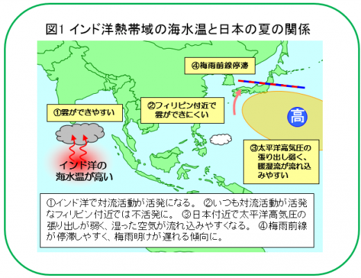 現在、インド洋熱帯域の海水温は高い水準となっており、今秋に向けて徐々に平年並みに向かいますが、今夏までは高めで推移する予想となっています。インド洋熱帯域の海水温が高いと、近接するフィリピンの周辺の対流活動に作用し、それが太平洋高気圧の勢力の張り出しを弱め、日本の夏の天候不順につながる傾向があることが過去の研究によって示されています(図1)。