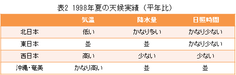 その1998年夏は、一言でまとめると「北冷西暑」の気温分布でした。北陸及び東北南部、東北北部では梅雨明けの発表がなく、西日本太平洋側や南西諸島を除いて全国的に日照時間が平年より少なくなりました(表2)。また、北日本中心に雨が多く、8月は秋雨前線や台風の影響で、福島・栃木・新潟などで記録的な大雨による被害も発生しました(平成10年8月上旬豪雨、平成10年8月末豪雨)。秋は全国的に気温が高めとなったものの、台風が5号、7号、8号、10号と立て続けに上陸し、活発化した秋雨前線の影響もあり、各地で記録的な大雨や暴風になりました。