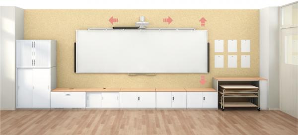 文部科学省は、1学級当たり1台の電子情報ボード設置を目標としています。そこで本カタログでは、電子情報ボードと普段使っていない黒板下スペースを活用した「普通教室のICT対応と高機能化」を提案します。配線機能付き多機能収納庫を組み合わせて機能面・安全面、そして綺麗さや気持ちよさといった空間の質にも配慮しました。電子情報ボードや家具の配置のほか、配線工事も含めワンストップで対応します。