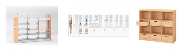 理科実験で使用する薬品びんやビーカーなど、教科特有の収納物の整理ができ、授業の準備・後片付けがスムーズに行えるトレーを充実させた収納庫です。木製品が多い中、堅ろうかつ低コストで導入可能なスチール製品を提案します。