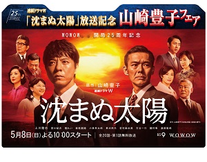 企画第1弾は「連続ドラマW 沈まぬ太陽」放送記念「山崎豊子」フェアを実施。ドラマの原作となる『沈まぬ太陽』(新潮文庫)は、未曽有の航空機墜落事故という悲劇の裏で信念を貫き巨大組織に生きる人々を描いた、作家・山崎豊子氏の代表作です。本ドラマは、WOWOW開局25周年記念作品で、上川隆也、渡部篤郎など豪華キャストが出演します。またアフリカや中東ロケなどドラマWシリーズでかつてない規模で製作され、全20話の放送予定です。