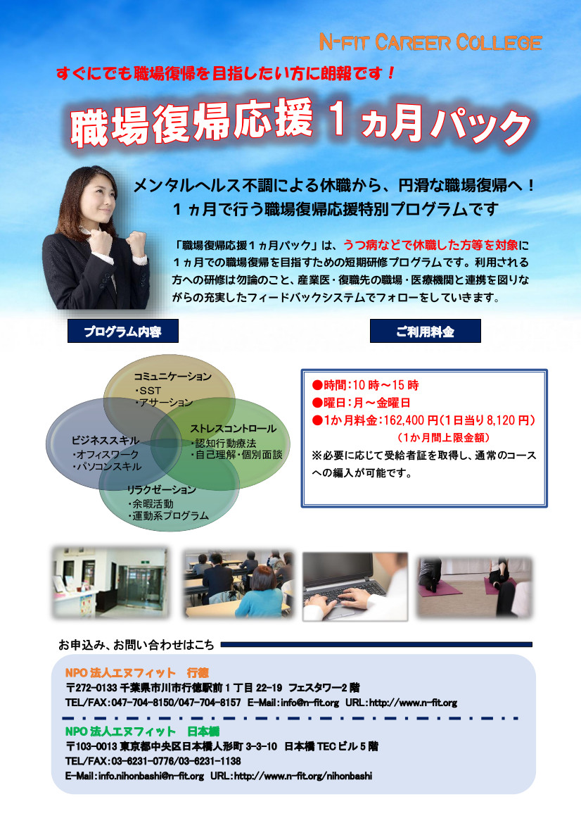 障がい者の就労トレーニングを行うNPO法人エヌフィット(法人所在地:東京都中央区、代表理事:山本剛)はうつ病などで休職した方を対象とし、1か月で職場復帰を目標とする 職場復帰応援1ヶ月パック を2016年5月1日より新たに導入しました。