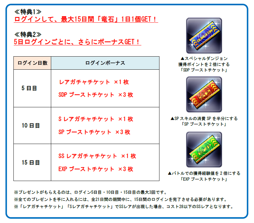 ログイン10日目…Sレアガチャチケット ×1枚・SPブーストチケット ×3枚