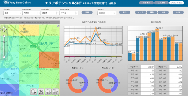 「3rd Party Data Gallery On Demand」は、第三者データを利用した分析ダッシュボードをコンテンツとして提供するWebサービスです。サービス開始時点ではエリアマーケティングデータや訪日外国人動態データを中心に64コンテンツを用意し、年内200コンテンツを提供する予定です。利用価格は3,000円(税別)~となっており、クレジットカードによるオンライン決済となります。