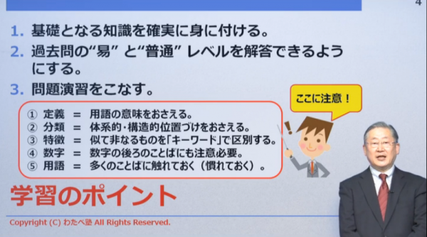 本講座では、マンション管理士として実務家として活躍され、受験対策講座の第一人者でもある、わたべ塾の渡部正和先生が、まず合格に必要な最低限の基礎知識を解かりやすく講義いたします
