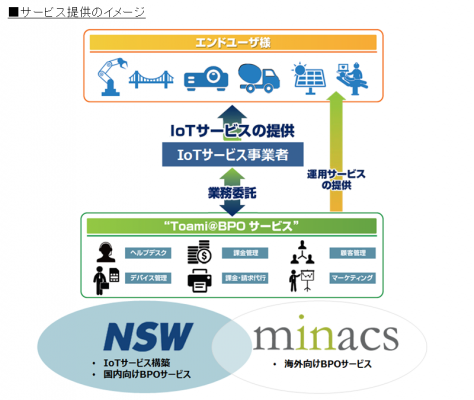 このたび開始したグローバルBPOサービスは、企業がユーザーにIoTサービスを展開するにあたり必要となる課金管理やアカウント管理のしくみなど、バックオフィスの業務プロセスの設計から運用までを提供するものです。海外におけるシステム基盤にはミナクス社のマネジメントサービス「Aurora GenC(オーロラジェンシー)」を利用してIoTサービスの新規立ち上げにともなう業務負荷の軽減を実現すると共に、NSWがこれまで国内向けに提供してきたBPOサービスを拡張し、ミナクス社が事業展開する海外拠点においてもサービスを提供することが可能となります。