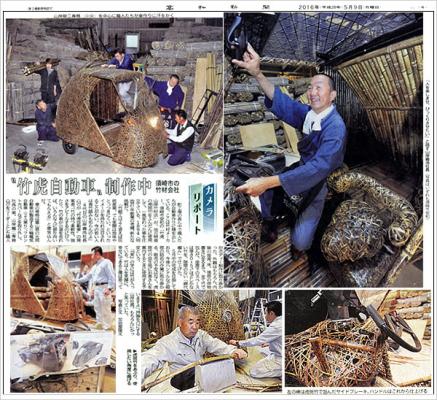 高知県に密着したニュースを毎日配信している地元紙、高知新聞は高知県民にはおなじみの新聞です。この高知新聞の2016年5月9日(月)発行の朝刊、カメラリポートのコーナーで虎斑竹を使った日本唯一の虎竹自動車の制作の様子を掲載していただきました。