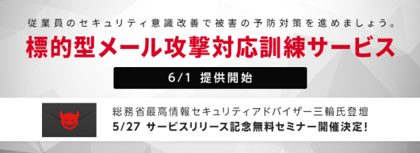 株式会社パイプドビッツ(東京都港区、代表取締役社長CEO 林哲也、東証1部パイプドHDグループ<証券コード3919>、以下「パイプドビッツ」)は、2016年6月1日に、新サービス「標的型メール攻撃対応訓練サービス」を提供開始します。また、新サービスリリース記念セミナー(参加費無料)を5月27日に開催しますので、併せてお知らせいたします。