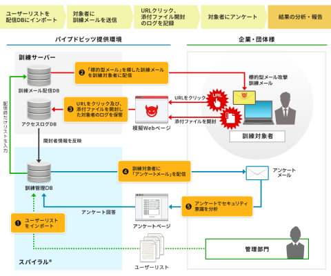 パイプドビッツは、「情報資産の銀行」を経営理念に掲げ、高セキュアなクラウドプラットフォームを幅広い業種・業態のお客様に提供しており、「軽率な判断等によるたった1つの事故が、創業以来、地道に積み上げてきた信頼のすべてを無に帰す」という認識のもと、標的型サイバー攻撃への対策強化方針を策定するなど、セキュリティ/安全安心の維持のために、従業員1人1人が意識と実践を伴いながら日々の業務に取り組んでいます。従業員への標的型メール擬似訓練を通じて、当事者意識や、真贋の見極め、悪意ある偽物メールの傾向やポイントなど、セキュリティ意識練磨を確認できており、このたび、独自ノウハウを活かし「標的型メール攻撃対応訓練サービス」を開発しました。