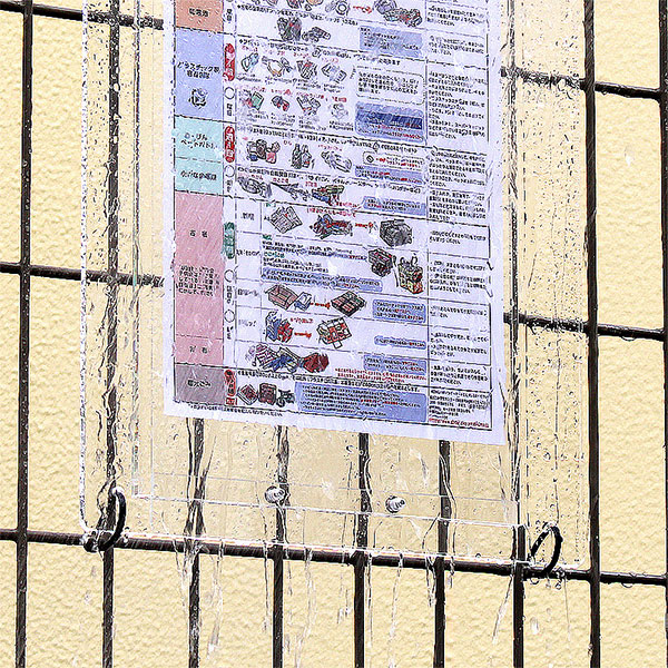 屋外専用に開発された簡易防水設計のポスターフレーム。ポスターを下からスライドして収める構造で、多少の雨ではポスターが濡れません。