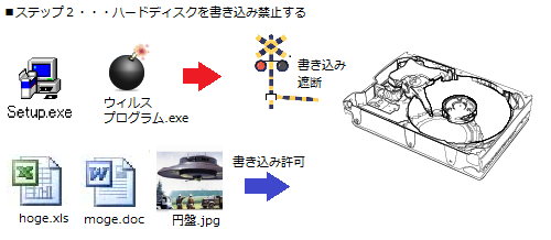 2. ハードディスクへ限定的ROM化。ディスクにプログラムの書き込み禁止機能を付与しウィルスを感染防止します。
