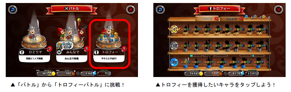 「トロフィーバトル」は、各キャラのトロフィー獲得を目指して、全国のプレイヤーとバトルを行ないます。