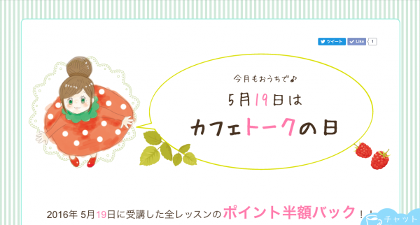 カフェトークのオンラインレッスン料となる「ポイント」が後日半額返還される、特別なポイントバックデーの毎月19日は「カフェトークの日」。