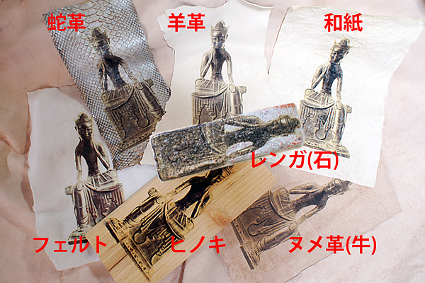 和紙・フェルト・蛇革・羊革・ヌメ革(牛)・木・レンガ素材にプリントしたものです。