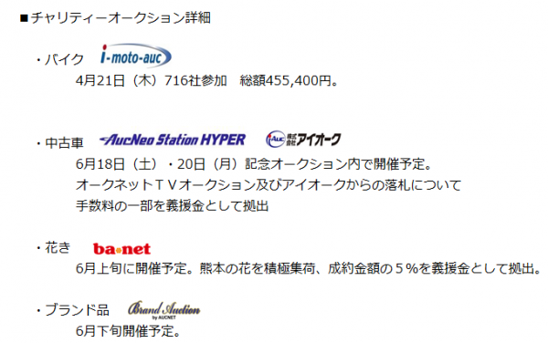 4月21日(木)開催の第1117回バイクオークションをはじめ、中古車・花き・ブランド品のチャリティーオークションを開催し、手数料の一部やチャリティー商品の売上にオークネットからの寄付を合わせ義援金として被災地に寄付します。