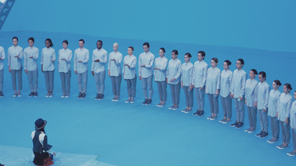 20人バージョンは基本的に、一連のアクションをワンテイクで収録。集団の動きが模様や柄のように見える俯瞰の撮影では、立ち位置がほんの少しズレただけでも美しさに欠け、名刺の受け渡しや動き出しのタイミングが一拍遅れるたびに、一からやり直しました。ようやく監督からOKが出たのは、リハーサル開始から数えて約5時間後。その瞬間、キャストの皆さんはハイタッチをしたり、ハグをしたりして、お互いの労をねぎらい、体の中から自然と湧き上がる達成感と喜びを大いに味わっていました。