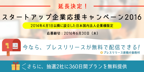 グローバルインデックス株式会社が運営するプレスリリース配信代行サービス『ドリームニュース』(http://www.dreamnews.jp)は、設立が2014年4月以降の法人企業を対象とした、プレスリリースを1回無料で配信できる『スタートアップ企業応援キャンペーン2016』(http://www.dreamnews.jp/campaign/2016/)の申込受付期間を2016年6月30日(木)まで延長致します。