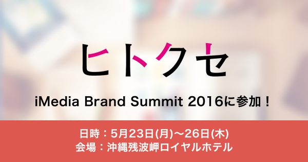 動画広告やネイティブ広告、リッチメディア広告の配信プラットフォームを提供する、株式会社ヒトクセ(本社:東京都新宿区、代表取締役:宮崎航、以下「ヒトクセ」)は、2016年5月23日(月)~26日(木)の4日間、沖縄残波岬ロイヤルホテルで開催される「iMedia Brand Summit 2016」に参加いたします。