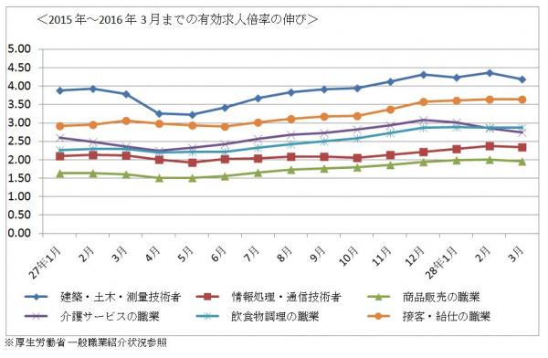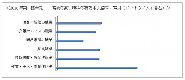 その他の職種では、売上に直結する営業人材(1.30倍)が求められたほか、技術者や事務管理部門の専門職の引き合いが続いています。建築・土木関連技術者(4.61倍)、情報処理・通信技術者(2.43倍)など、「専門的・技術的職業」と呼ばれる職種カテゴリーは全般に引き合いが強く(2.02倍)、デジタルマーケティング、医療機器の機器開発など高度な専門知識を持つ人材の引き合いが強まっていることなどが背景にあります。企業による事業拡大のためのIT投資が続いているほか、マイナンバーや2018年に導入予定のVAT(付加価値税)に対応するためにビッグデータ導入が進んでおり、コンサルタントや、ITエンジニア採用の拡大などにつながっています。また、保健師、助産師、看護師(2.77倍)をはじめとるする医療・福祉関連でも人材需要が伸びています。