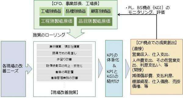 MRIと横河ソリューションサービスは、この中堅製造業をターゲットにした「ものづくり競争力強化支援サービス」の開発および事業化検討に本格的に着手します。このサービスの展開により、製造現場における日々の改善活動成果をキャッシュフローで評価する仕組みを基盤として、従来の強みである「現場の力」や「緻密に構築された生産設備群」とIoTを融合させ、経営成果を創出する「次世代ものづくりビジネス」の構築を目指します(図1)。