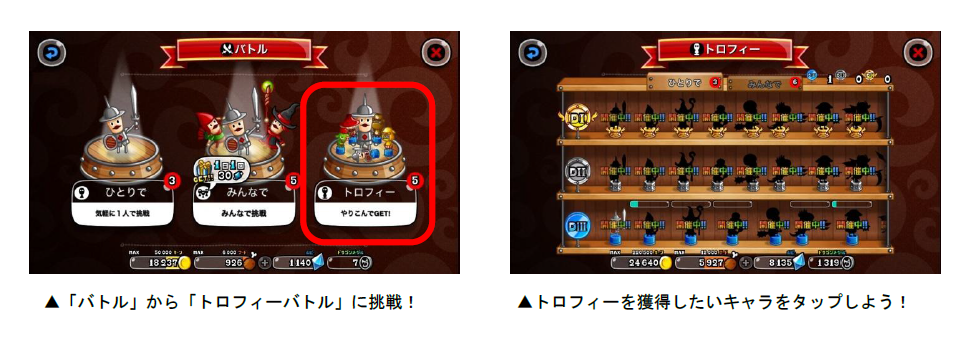 「トロフィーバトル」は、各キャラのトロフィー獲得を目指して、全国のプレイヤーとバトルを行ないます。