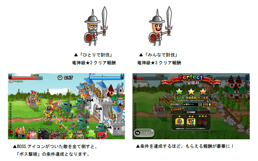 ステージクリア時に「落城勝利」「砦全占拠」「ボス撃破」、それぞれの条件を達成していると討伐報酬を