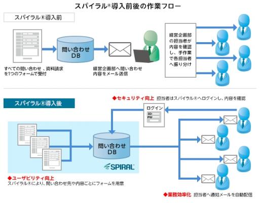 問合せ先や内容ごとにフォームの表示内容を最適化し、それぞれの担当者に直接通知メールがリアルタイムで届くうえ、各データベース(以下「DB」)へのアクセス権限により、担当者は、すべてのDBを閲覧するのではなく、対応する問合せDBだけを扱います。また、IPアドレス制限機能により、社外からはアクセスできない仕組みになっています。