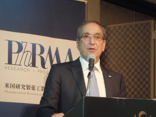 スキャンゴス会長は、日本政府がここ数年で行った薬価制度改革とイノベーション重視政策が日本や日本経済、日本の患者さんに大きな直接的利益をもたらしていると述べ、革新的な医薬品の価格を安易に下げることは、短期的には有効に思えるが、長期的には日本の患者さんやヘルスケア関連企業、さらには日本経済にとって必ずしも有益とは言えず、イノベーション重視の姿勢をとり予測可能な政策環境を整えることで、国内外のイノベーションや日本への投資が後押しされ、最も革新的な薬を短期間で日本の患者さんに届けることができるようになると同時に医療産業が経済成長に貢献できるなどのPhRMAの政策提言を説明しました。