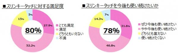 当社がスリンキータッチに対する顧客満足度調査を実施したところ、全体の80%(とても満足:27.9%、満足:52.2%)が商品に対して満足、全体の78%(ぜひ今後も使い続けたい:31.6%、やや今後も使い続けたい:46.8%)が今後も使い続けたいと回答しました。