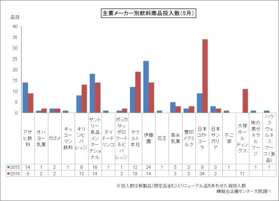 ■弊社で継続して調査している飲料新製品発売状況によると、主要メーカー21社における2016年5月の飲料商品投入数は合計128品目(前年同時期比23品目増)であった。具体的には、日本コカ・コーラが34品目で最も多く、次いでヤクルト本社が19品目となった。以下、伊藤園とサントリー食品インターナショナル(各14品目)、キリンビバレッジ(13品目)が10品目以上の投入数となっている。