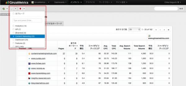 また、任意に設定したキーワードグループ単位での競合サイト発見も可能です。例えば、アイテム別、ブランド別、エリア別等、こだわり条件別などで設定したキーワードグループでの、競合サイトを確認していただけます。