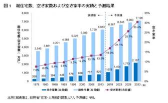 NRIの予測では、既存住宅の除却や、住宅用途以外への有効活用が進まなければ、2033年の総住宅数は約7,130万戸へと増大し、空き家数は約2,170万戸、空き家率は30.4%へと、いずれも上昇する見込みです。