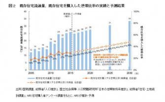 2000~2015年の各年における住宅購入者(日本全国の25~59歳の男女9,204名)を対象にNRIが実施したアンケート調査によると、既存住宅を購入した世帯の比率は、2005年の18%から2015年には29%に増加しました。この傾向が2016年以降も継続すると仮定すると、既存住宅流通量は2025年に31万戸、2030年に34万戸へ増加すると予測されます。