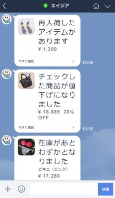 インターネットを活用したマーケティングソリューションを提案する株式会社エイジア(本社:東京都品川区、代表取締役:美濃 和男、東証マザーズ上場:証券コード2352、以下 当社)は、LINE ビジネスコネクトを活用したパーソナライズメッセージ配信システム「WEBCAS taLk」( http://webcas.azia.jp/talk/ )に、ECサイトでお気に入り商品を登録したユーザに「値下げしました」「再入荷しました」などのメッセージをLINEで自動配信できる新機能を搭載し、本日より提供を開始いたしました。