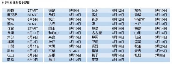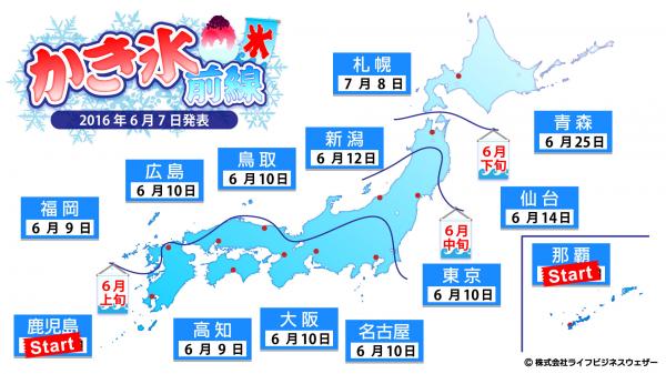 北陸と東北も、この先気温が平年より高く推移する予想で、例年に比べてかなり早く、かき氷シーズンが訪れそうです。 6月下旬には、かき氷前線は青森まで到達するでしょう。