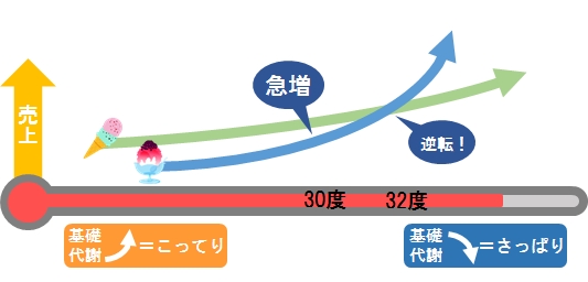 なお、約32度でかき氷とアイスクリームの売り上げが逆転することもわかっています。