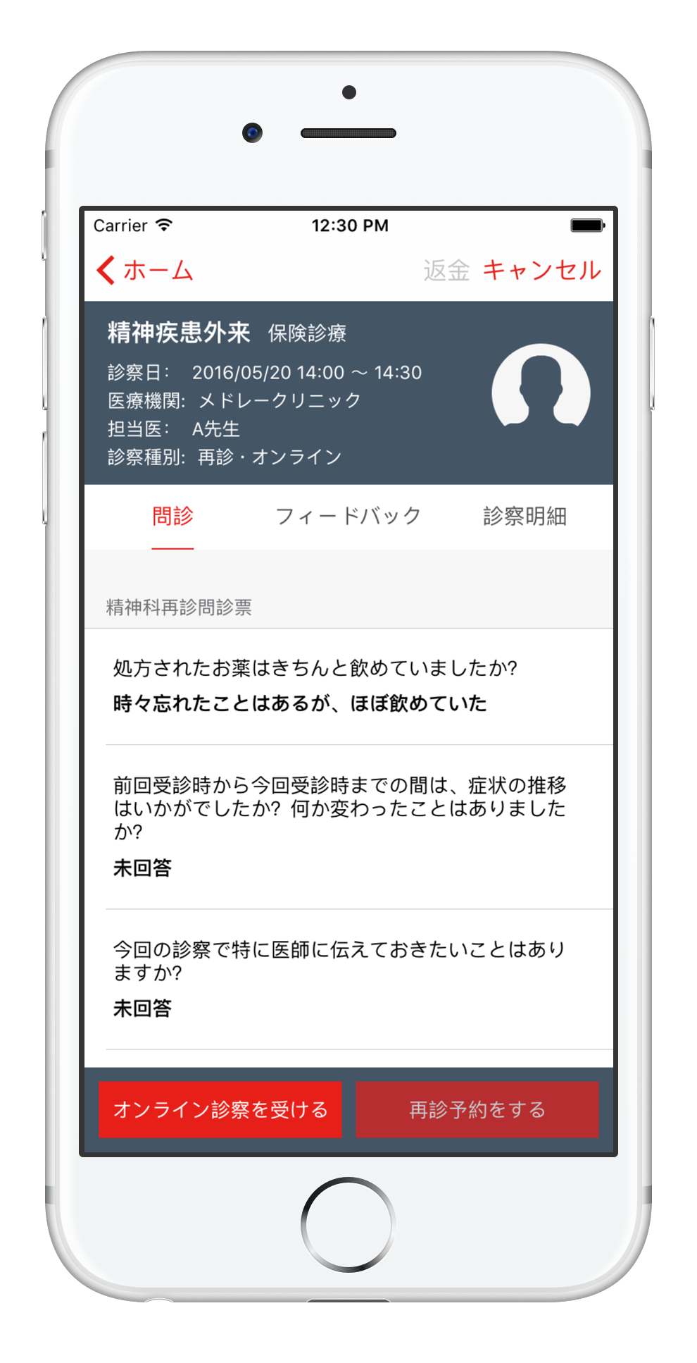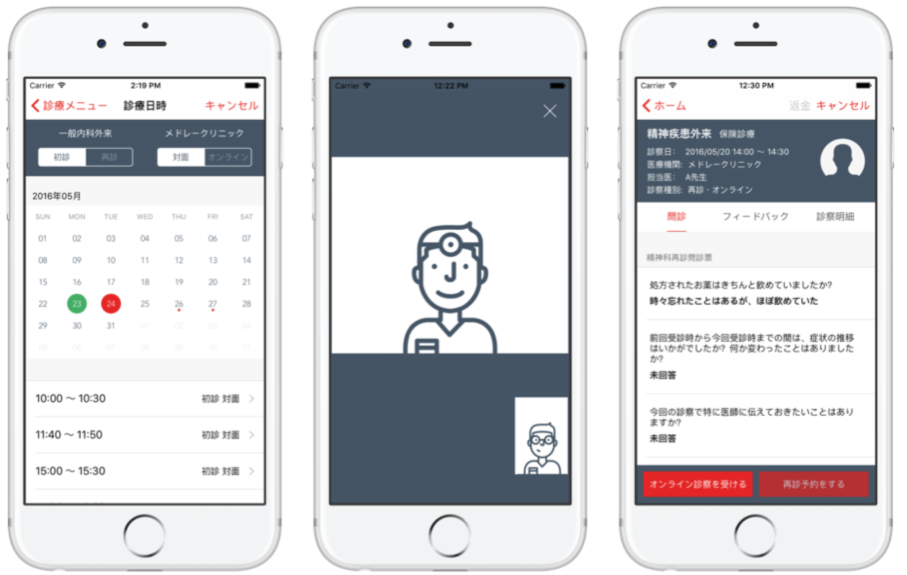 左から予約、オンライン診察、診察履歴画面のイメージです。
