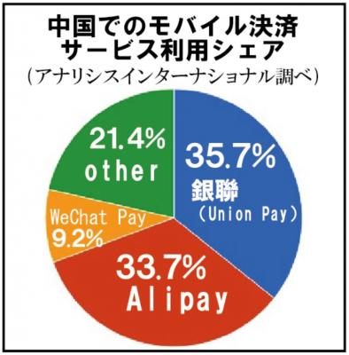 ■Alipay → 中国国内で広く浸透している世界有数な決済プラットフォームとして実名認証のユーザー数を8億人以上の決済サービス。中国最大の第三者オンライン決済システムで、ユーザー数8億人超え、1日の取り扱い件数は1億580万件、2014年Alipay決済総額8兆8161億元(約167兆5060億円)、モバイル端末による決済総額7兆7660億元(約147兆5540億円)、モバイル決済市場占有率68%と言われている。