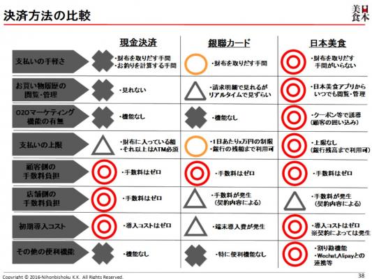 『日本美食』は、中国において3.5億人が利用する(2015年度)スマホを使った決済サービスの最大手3社、「銀聯(Union Pay)」、「Alipay」、「WeChat Pay」を提供しています。この決済サービス全てを実店舗で導入するのは、博多屋 大吉 銀座店が日本初となります。