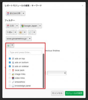 また、GinzaMetricsカスタムダッシュボードにおいても、ユニバーサルサーチのフィルター設定ができます。これにより、ユニバーサル検索・リスティング広告が表示されないキーワードを一覧で確認することも可能です。