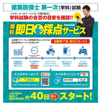 本サービスは建築設備士試験の採点を無料で行うもので、試験終了直後から受付を開始します。お手持ちのスマホ・ケータイ・パソコンから簡単にご利用いただくことが可能です。